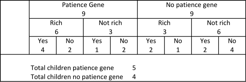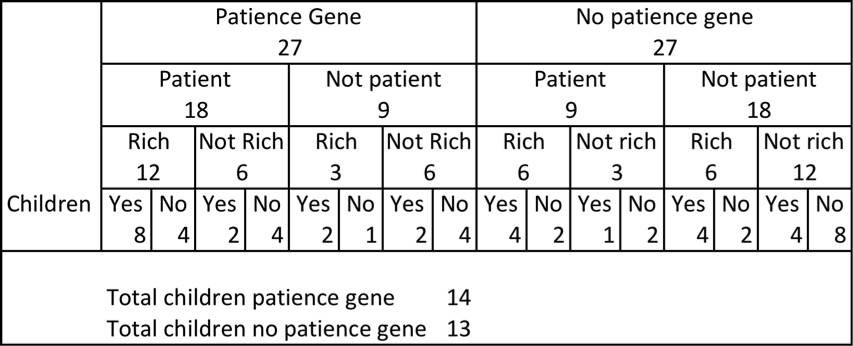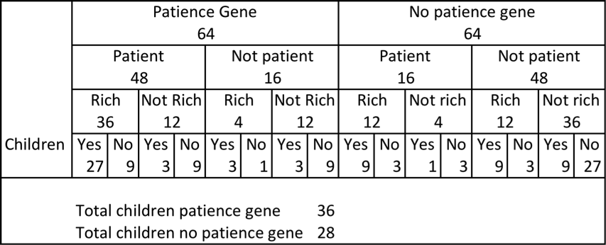 His argument was based on the following example. Suppose there is a patience gene in the population. Assume that each person with the patience gene has a two-thirds chance of being patient while those without the gene have a one-third chance. Of those who are patient, they have a two-thirds chance of being rich, versus one-third for the others. Finally, assume that those who are rich have a two-thirds chance of having children, while the rest have a one-third chance.