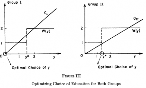 The following diagram shows Spence’s result. Each type of worker could be paid high or low wages. The employer will only pay high wages to workers with an education level above y*. In this case, the cost of education for the low productivity “Group I” is such that they do not undertake education, while members of the high productivity “Group II” educate themselves to y*. The benefit of education outweighs the costs for “Group II” only.
