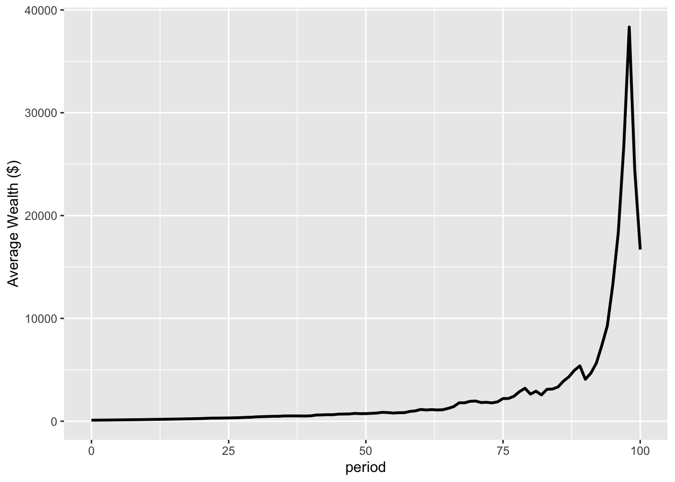 # Load the required packageslibrary(ggplot2)library(scales) #use the percent scale later# Create a function for running of the bets.bet <-function(p, n, t, start=100, gain, loss, ergodic=FALSE, absorbing=FALSE){#p is probability of a gain#n is how many people in the simulation#t is the number of coin flips simulated for each person#start is the number of dollars each person starts with#if ergodic=FALSE, gain and loss are the multipliers#if ergodic=TRUE, gain and loss are the dollar amounts#if absorbing=TRUE, zero wealth ends the series of flips for that person params <-as.data.frame(c(p, n, t, start, gain, loss, ergodic, absorbing))rownames(params) <-c("p", "n", "t", "start", "gain", "loss", "ergodic", "absorbing")colnames(params) <-"value" sim <-matrix(data =NA, nrow = t, ncol = n)if(ergodic==FALSE){for (j in1:n) { x <- startfor (i in1:t) { outcome <-rbinom(n=1, size=1, prob=p)ifelse(outcome==0, x <- x*loss, x <- x*gain) sim[i,j] <- x } } }if(ergodic==TRUE){for (j in1:n) { x <- start for (i in1:t) { outcome <-rbinom(n=1, size=1, prob=p)ifelse(outcome==0, x <- x-loss, x <- x+gain) sim[i,j] <- xif(absorbing==TRUE){if(x<0){ sim[i:t,j] <-0break } } } } } sim <-rbind(rep(start,n), sim) #placing the starting sum in the first row sim <-cbind(seq(0,t), sim) #number each period sim <-data.frame(sim)colnames(sim) <-c("period", paste0("p", 1:n)) sim <-list(params=params, sim=sim) sim}# Simulate 10,000 people who accept a series of 1000 50:50 bets to win \$50 or lose \$40 from a starting wealth of \$100.set.seed(20191215)nonErgodic <-bet(p=0.5, n=10000, t=1000, gain=1.5, loss=0.6, ergodic=FALSE)# Create a function to generate summary statistics.summaryStats <-function(sim, t=100){ meanW <-mean(as.matrix(sim$sim[(t+1),2:(sim$params[2,]+1)])) # mean wealth medianW <-median(as.matrix(sim$sim[(t+1),2:(sim$params[2,]+1)])) # median wealth num99 <-sum(sim$sim[(t+1),2:(sim$params[2,]+1)]<(sim$params[4,]/100)) #number who lost more than 99% of their wealth per99 <- num99/sim$params[2,]*100#percentage who lost more than 99% of their wealth numGain <-sum(sim$sim[(t+1),2:(sim$params[2,]+1)]>sim$params[4,]) #number who gain perGain <- numGain/sim$params[2,]*100#percentage who gain num100 <-sum(sim$sim[(t+1),2:(sim$params[2,]+1)]>(sim$params[4,]*100)) #number who increase their wealth more than 100-fold winner <-max(sim$sim[(t+1),2:(sim$params[2,]+1)]) #wealth of wealthiest person winnerShare <- winner /sum(sim$sim[(t+1),2:(sim$params[2,]+1)]) #wealth share of wealthiest person stats <-data.frame(meanW = meanW, medianW = medianW, num99 = num99, per99 = per99, numGain = numGain, perGain = perGain, num100 = num100, winner = winner, winnerShare = winnerShare)}nonErgodicStats <-summaryStats(nonErgodic, 100)# Create a function for plotting the average wealth of the population over a set number of periods.averagePlot <-function(sim, t=100){ basePlot <-ggplot(sim$sim[c(1:(t+1)),], aes(x=period)) +labs(y ="Average Wealth ($)") averagePlot <- basePlot +geom_line(aes(y =rowMeans(sim$sim[c(1:(t+1)),2:(sim$params[2,]+1)])), color =1, linewidth=1) averagePlot}averagePlot(nonErgodic, 100)