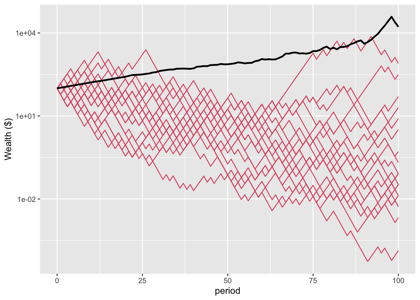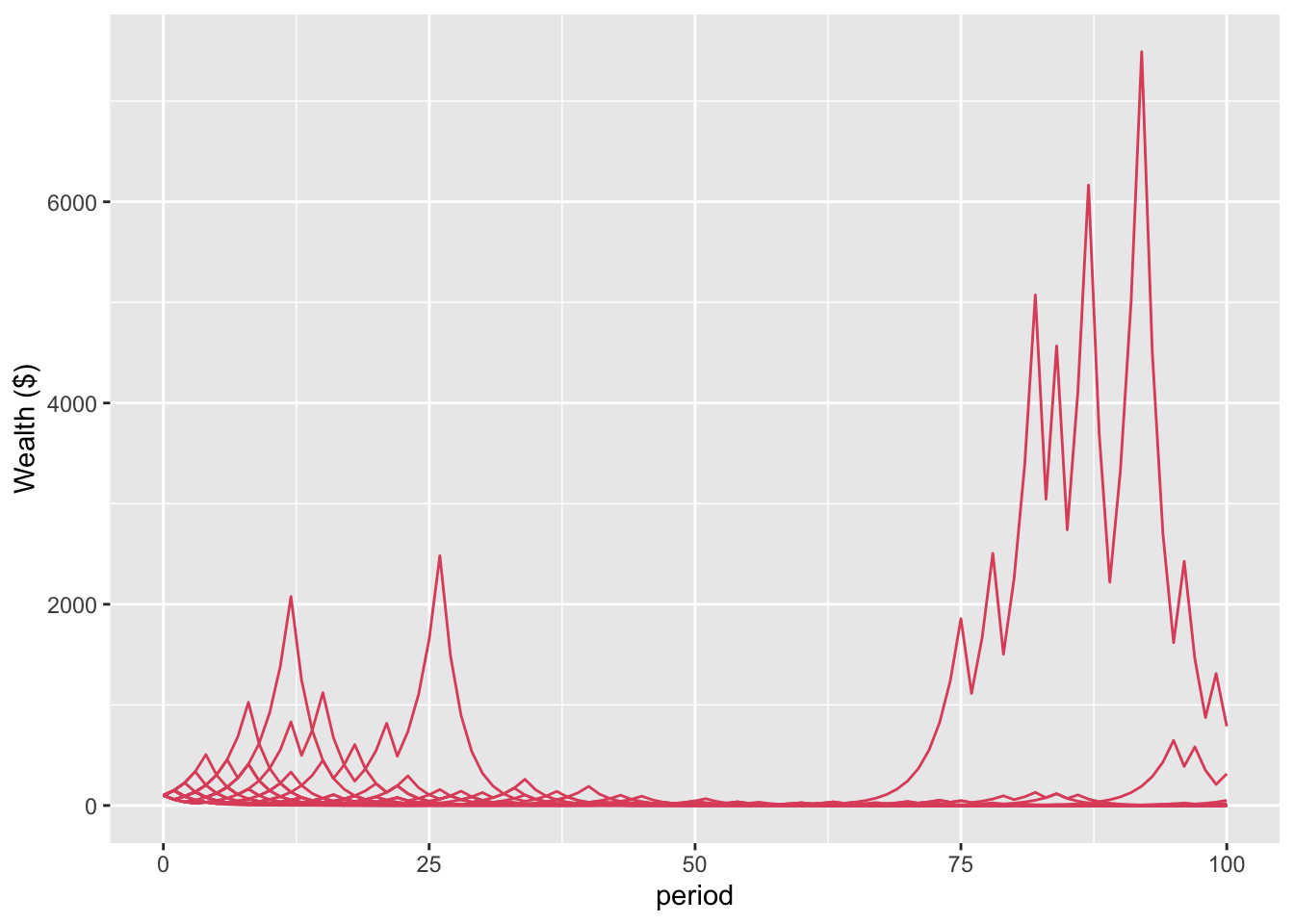 We can see that despite a large peak in wealth around period 400, wealth ultimately plummets. Average wealth at period 1000 is $24, below the starting average of $100, with a median wealth of 1x10-21 (rounding to the nearest cent, that is zero). The wealthiest person has $242 thousand dollars, with that being 98.5% of the total wealth. If we followed that wealthy person for another 1000 generations, I would expect them to be wiped out too. [I tested that. At 2000 periods the wealthiest person had $4x10-7.] Despite the positive expected value, the wealth of the entire population is wiped out.