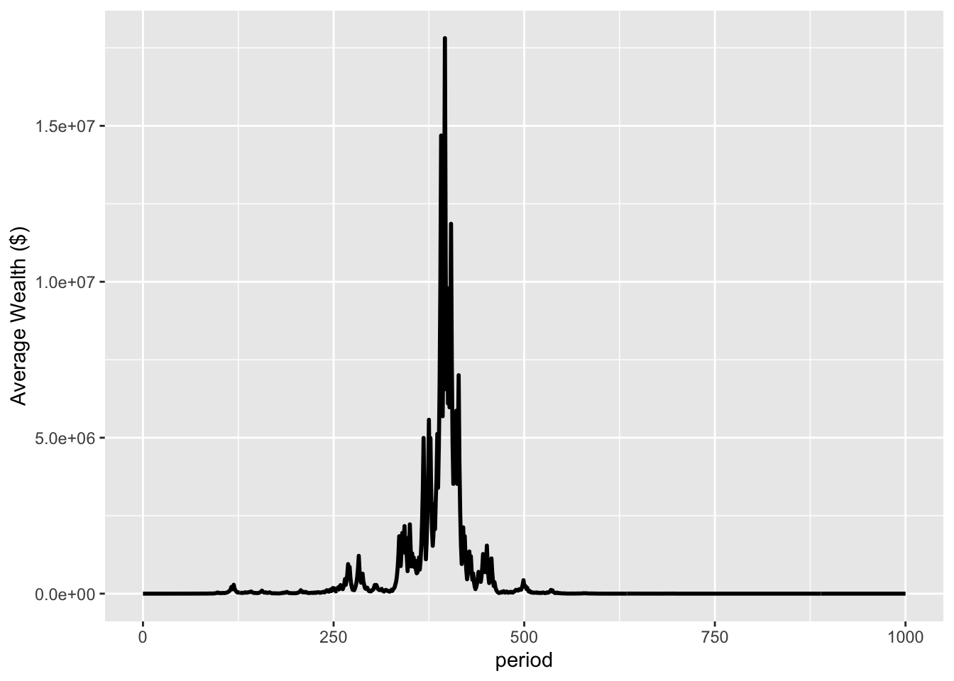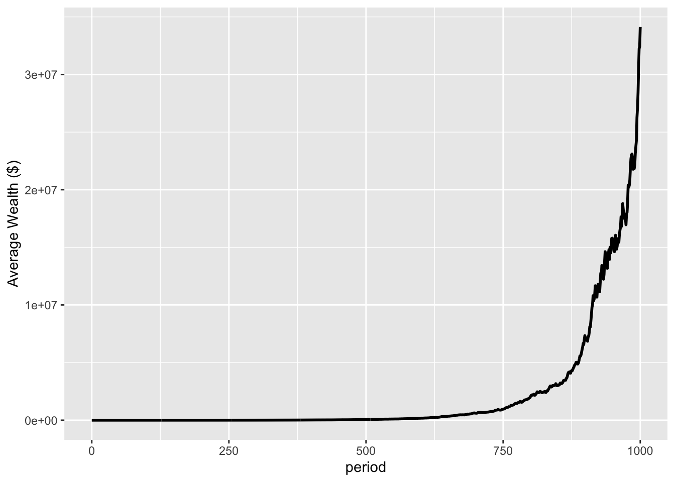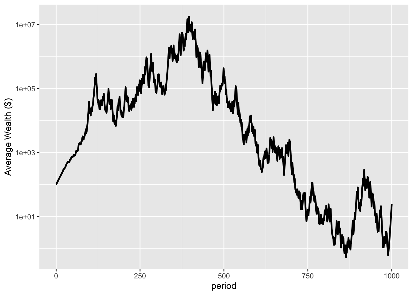 nonErgodicStats1000 <-summaryStats(nonErgodic, 1000)# Plot the average wealth of the non-ergodic simulation over 1000 periodsaveragePlot(nonErgodic, 1000)