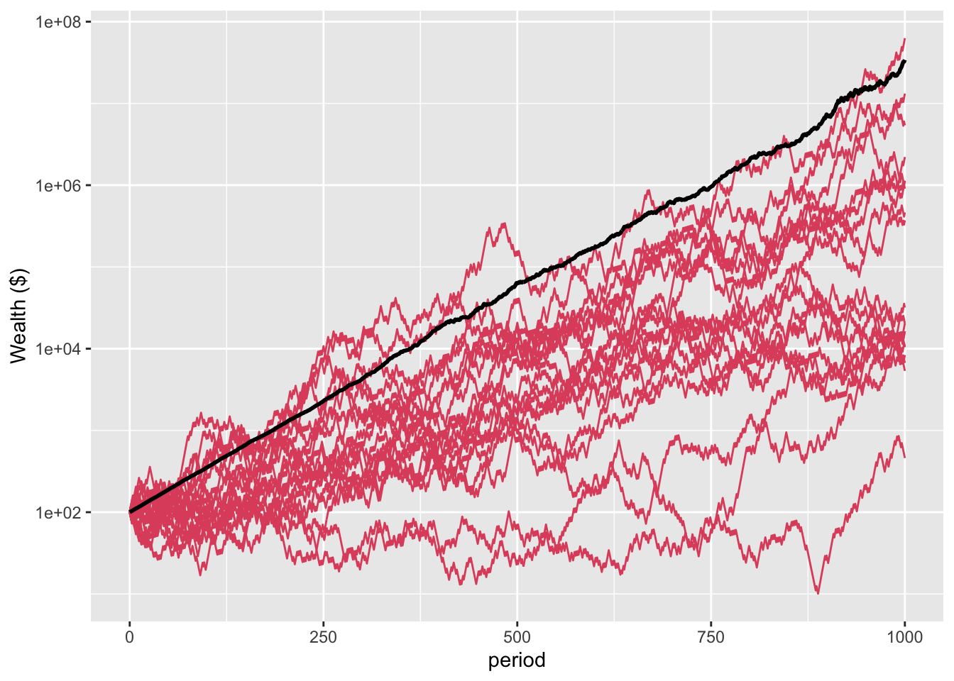 The first 100 periods of bets forces us to hold a counterintuitive idea in our minds. While the population as an aggregate experiences outcomes reflecting the positive expected value of the bet, the typical person does not. The increase in wealth across the aggregate population is only due to the extreme wealth of a few lucky people.