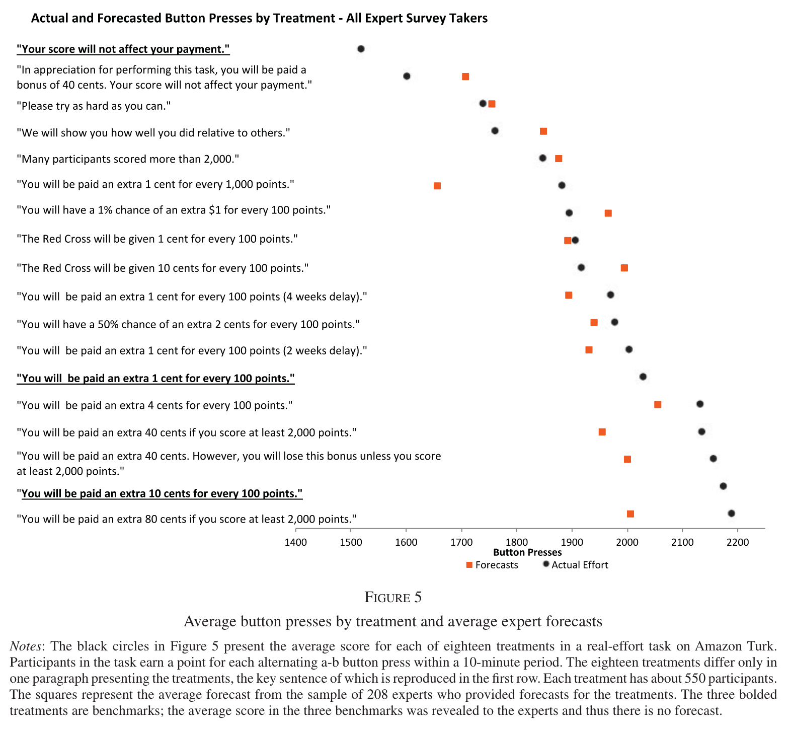 On the power of psychological interventions versus incentives, ideally, we’d want a suite of studies comparing the two directly. List has a couple of studies where the psychological intervention outperforms the incentive. But it’s easy enough to find studies going the other way. Here’s one from DellaVigna and Pope (2018). In their particular (artificial) context, incentives were the more powerful motivator and effort scaled with the incentives. Amusingly, the “experts” predicting the results also underestimated the power of the incentives.