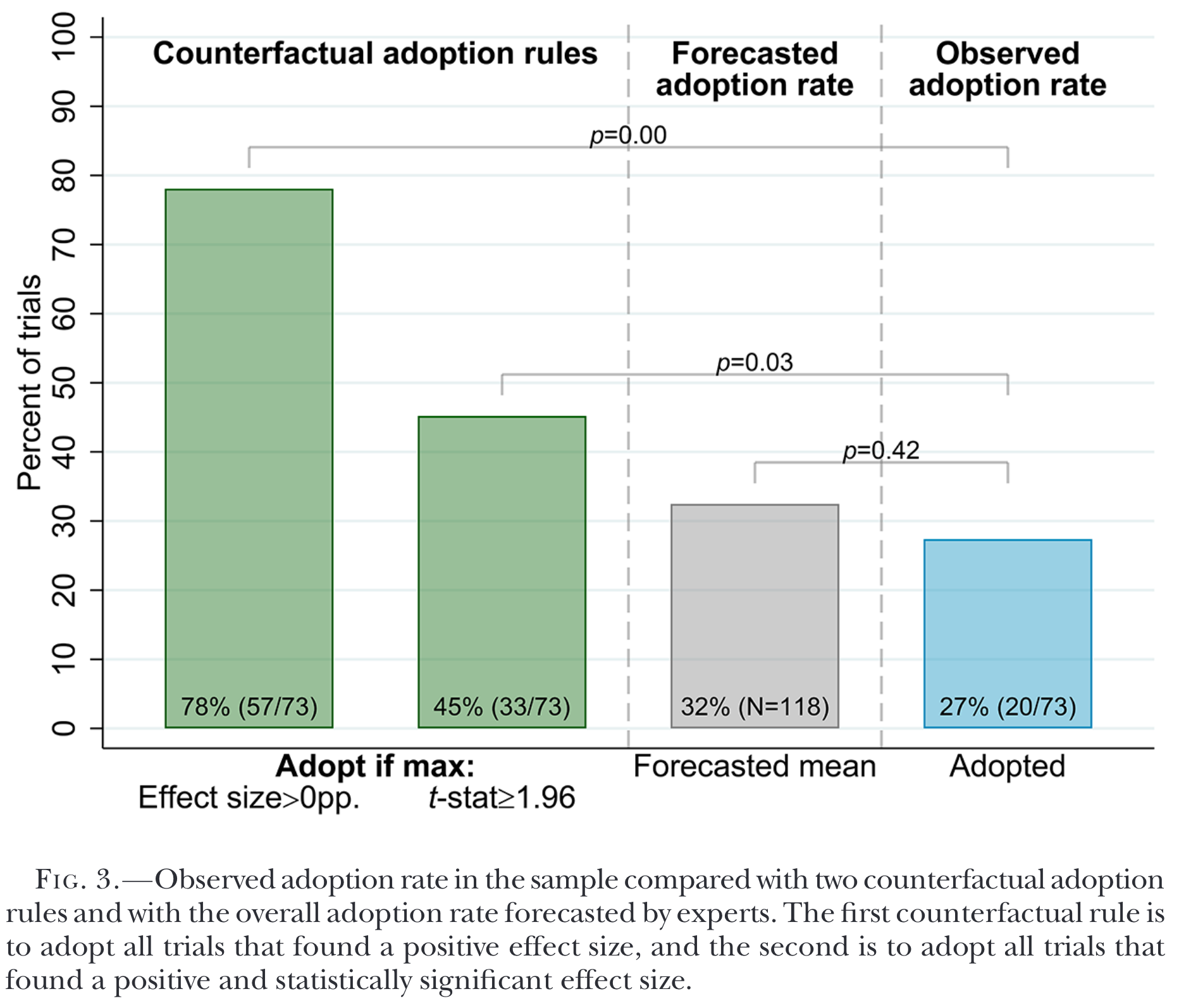 There is no difference in adoption for results with negative point estimates (25% adoption), results with positive but not statistically significant estimates (25%), and estimates that are positive and statistically significant (30%). The likelihood of adoption increases with effect size (measured in percentage points), from 17% in the bottom third to 38% in the top third, though this difference is not statistically significant at conventional levels.