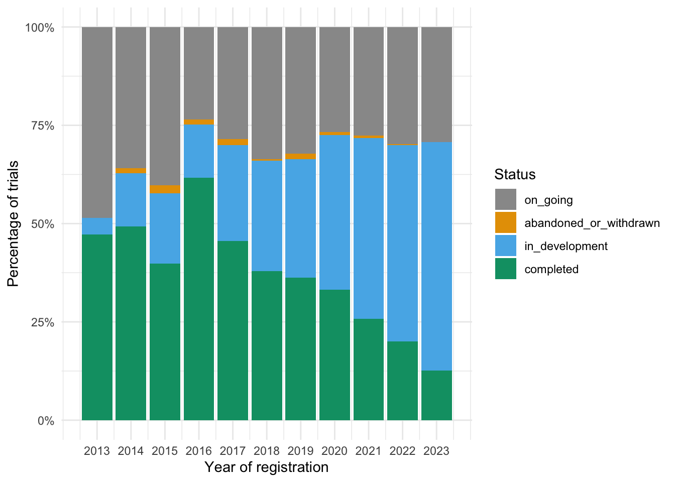 library(readr)library(ggplot2)library(tidyverse)# load data file, which is a subset of the AEA registry to 1 January 2024, available from https://doi.org/10.7910/DVN/HPYPGH# code to create subset from the raw csv file as follows, although not executed as part of this document - raw file too large to maintain on website# trials <- read_csv("trials.csv")#remove columns not used in this analysis + RCT_ID# trials <- trials %>% # select(RCT_ID, "First registered on", "Intervention end date", "End date", Status)#save as cvs named "trials-processed-jan-2024.csv"# write_csv(trials, "trials-subset-jan-2024.csv")trials <-read_csv("data/trials-subset-jan-2024.csv")# set order for charts so completed is first, then abandoned, then othertrials <- trials %>%rename(intervention_end_date ="Intervention end date",first_registered_on ="First registered on",end_date ="End date" ) %>%mutate(first_registered_year =year(first_registered_on),intervention_end_year =year(intervention_end_date),end_year =year(end_date) ) %>%mutate(Status =ifelse(Status =="abandoned"| Status =="withdrawn", "abandoned_or_withdrawn", Status)) %>%mutate(Status =factor(Status, levels =c("on_going", "abandoned_or_withdrawn", "in_development", "completed")))# colourblind palettecbPalette <-c("#999999", "#E69F00", "#56B4E9", "#009E73", "#F0E442", "#0072B2", "#D55E00", "#CC79A7")# plot of status by year of registrationggplot(trials, aes(fill=Status, x=first_registered_year)) +geom_bar(position="fill", stat="count") +scale_x_continuous(limits =c(2012.5, 2023.5), breaks =seq(2013, 2023)) +scale_fill_manual(values=cbPalette) +scale_y_continuous(labels = scales::percent_format()) +labs(x ="Year of registration", y ="Percentage of trials") +theme_minimal()