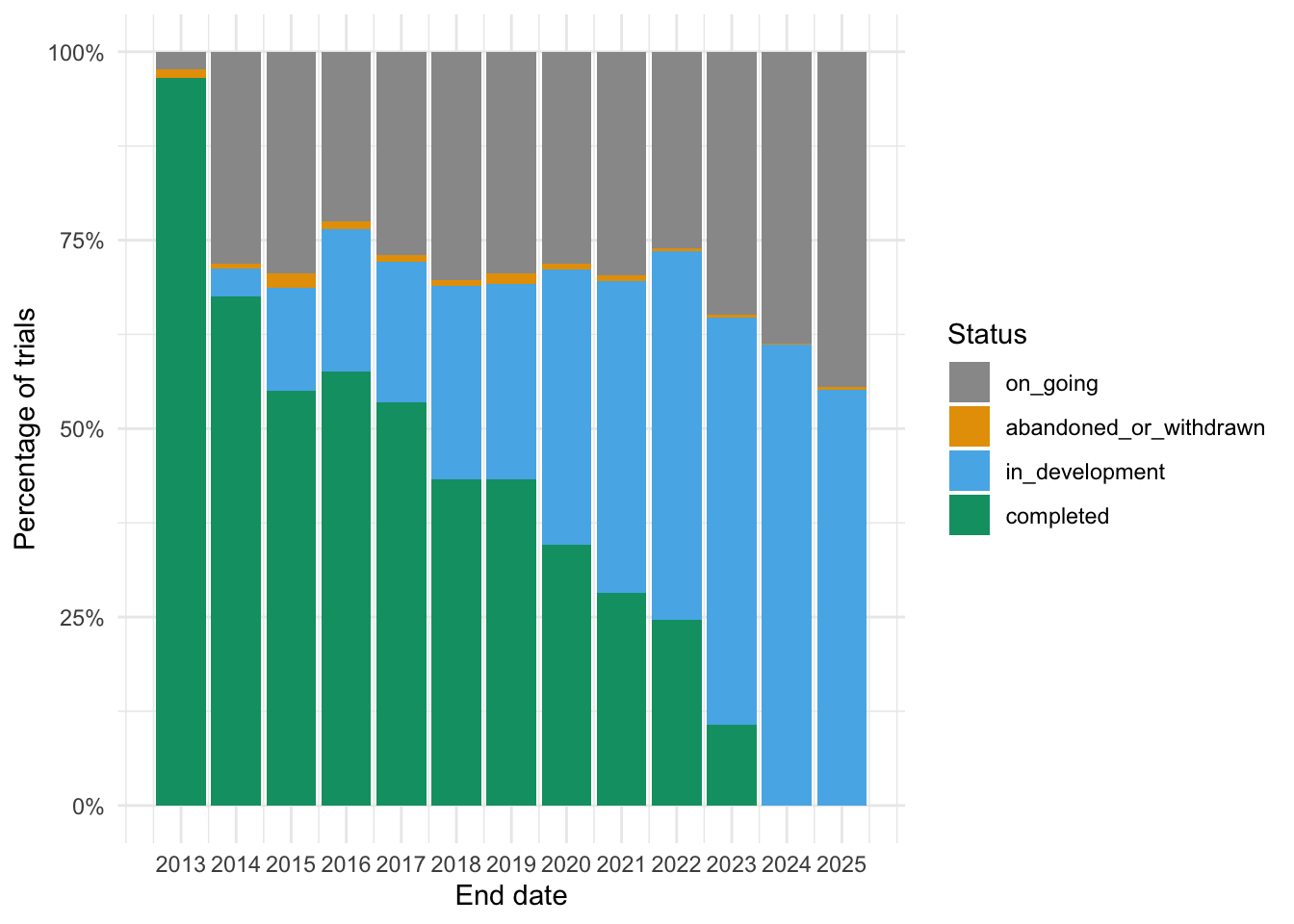# plot of status by reported end yearggplot(trials, aes(fill=Status, x=end_year)) +geom_bar(position="fill", stat="count") +scale_x_continuous(limits =c(2012.5, 2025.5), breaks =seq(2013, 2025)) +scale_fill_manual(values=cbPalette) +scale_y_continuous(labels = scales::percent_format()) +labs(x ="End date", y ="Percentage of trials") +theme_minimal()