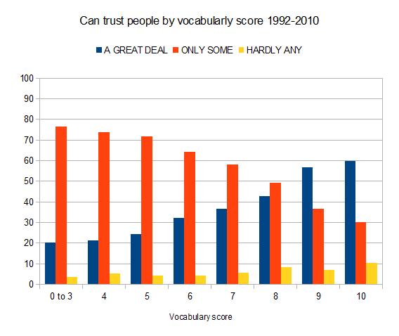Besides some interesting results, such as the level of trust in the media, what struck me was the strength of the link between trust and education or vocabulary scores.