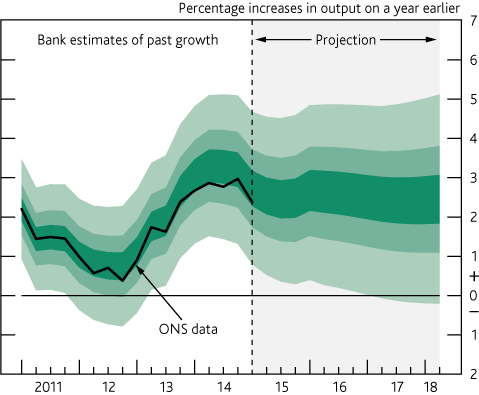 One interesting point was about the presentation of estimates of GDP growth. The Bank of England produces quarterly forecasts of GDP growth, but when they present them graphically, they don’t include their central estimate. The May 2015 graphic is below.