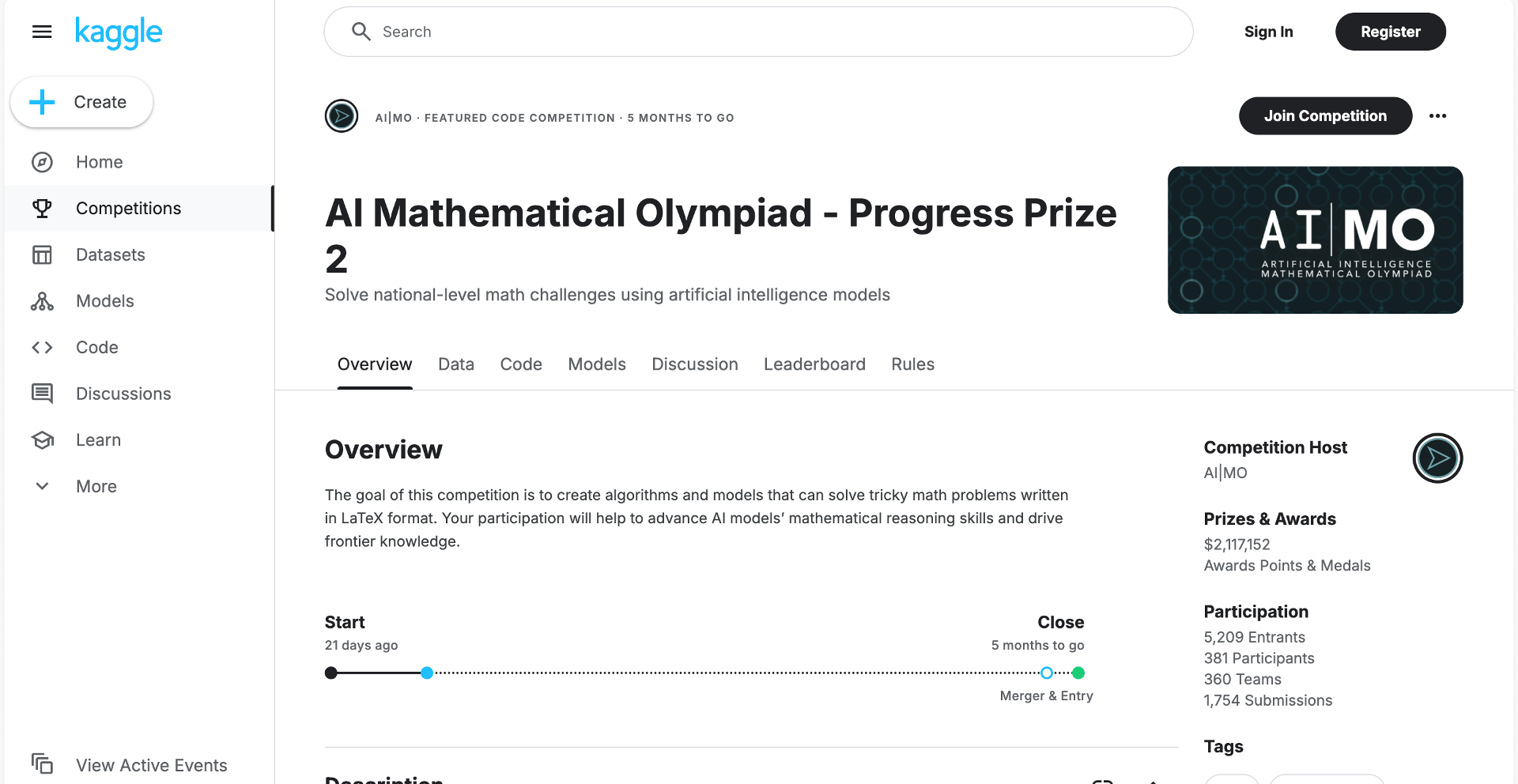 Kaggle has industrialised the running of these competitions for private and government entities. The organisation submits a problem and data, and competitors compete to develop the best algorithm. This Math Olympiad competition is running now. You can see that 1754 submissions had already been made by participants at the time I took this snapshot.