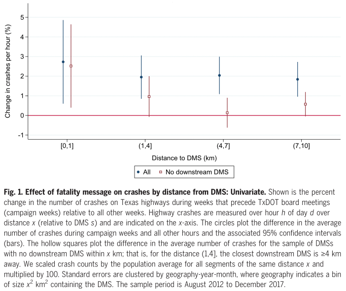 We used instrumental variables to recover the effect of displaying a fatality message and document a significant 4.5% increase in the number of crashes over 10 km. The effect of displaying fatality messages is comparable to raising the speed limit by 3 to 5 miles per hour or reducing the number of highway troopers by 6 to 14%. … The social costs of these fatality messages are large: Back-of-the-envelope calculations suggest that this campaign causes an additional 2600 crashes and 16 fatalities per year in Texas alone, with a social cost of $377 million per year.