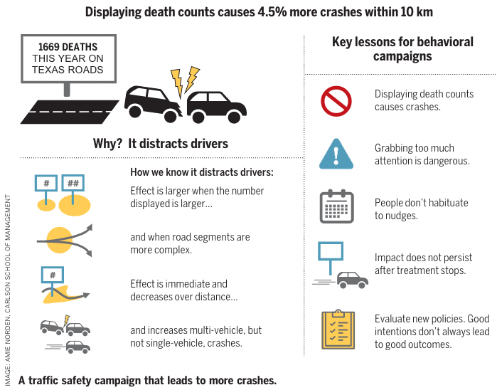 In a paper in Science, Jonathan Hall and Joshua Madsen proposed that dynamic signs that reported Texas road fatalities - “1669 deaths this year on Texas roads” - caused more accidents and fatalities.