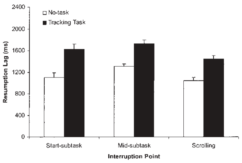 Later in the paper there are other references on distractions and driving. (The following summary is based on a quick glance, probably less than one minute with each paper. I might have missed something. If I revisit this paper, this is the first place I would dig deeper.) Four references (1, 2, 3, 4) relating to signs and billboards were about visual distraction, not ongoing cognitive load. Another referenced paper examines how long it takes to resume a task. The following figure gives a sense of the scale of the delay; the time on the vertical axis is in milliseconds.